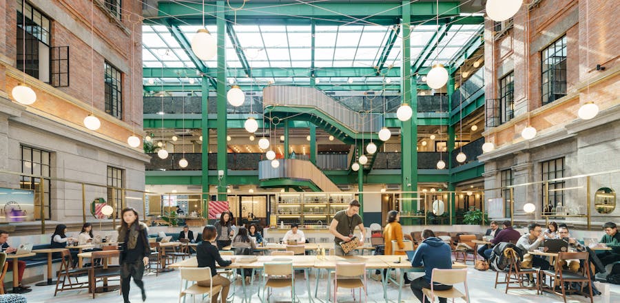 Tasarım şirketi Linehouse, eski bir afyon fabrikasını, işbirliği içinde çalışan WeWork için Çin'in amiral gemisinin ofisine dönüştürdü. Alan orijinal merdiveni ve çelik kirişleri hala bozulmadan eski ve yeniyi birleştiriyor.