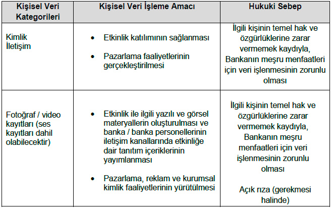 Bankamız ile olan ilişkiniz kapsamında kişisel verileriniz aşağıda yer verilen amaçlarla ve ifade edilen kanuni veri işleme şartlarına (“hukuki sebep”) dayalı olarak işlenmektedir: