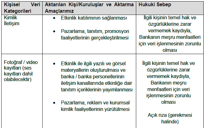 Bankamız ile olan ilişkiniz kapsamında kişisel verileriniz aşağıda yer verilen amaçlarla ve ifade edilen kanuni veri işleme şartlarına (“hukuki sebep”) dayalı olarak aktarılmaktadır: