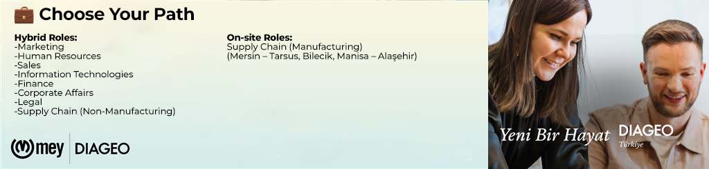 At Diageo Türkiye, your ideas make an impact. Through our Yeni Bir Hayat Internship Program, you’ll experience a workplace that values curiosity, collaboration, and personal growth. Apply now and take the first step toward a bright, rewarding future with us!