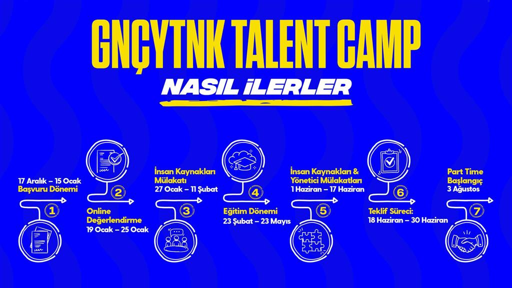 GNÇYTNK Talent Camp , geleceğin yeteneklerini yetiştirmek için tasarlanmış uygulamalı bir eğitim programıdır. Programı başarıyla tamamlayanların GNÇYTNK Part Time sürecine katılması hedeflenir.